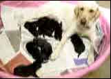 | Alda had her puppies on Wednesday, Oct 29 and Thursday, Oct 30. The first was born on the 29th about 5 pm and she finished in the wee morning hours of Oct 30, about 8-10 hours birthing her puppies. By using a video camera, we were able to view Alda from the Kennel Kitchen while she was in her stall in the maternity ward. Duing the visit we watched her get hand fed by a staff person, lick her puppies, get up for a drink of water, and lay back down and snuggle with the pups. She is being a good mom. | ||||||