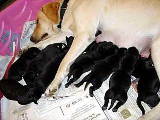 To prepare for whelping, they are put in stalls that contain plastic wading pools lined with newspapers. The stalls are warmed with radiant heating coils in the floor, and are equipped with closed-circuit cameras that allow the kennel staff to monitor the dogs' activities from afar (they can keep an eye on the expectant moms from the kennel kitchen during normal hours and from an on-campus studio apartment after hours). Births can occur as early as five days before the official due date. When the time is near, the females start to "nest"tearing the newspapers into small pieces and settling into the pools. During birth, the kennel staff will assist when needed. This assistance may involve resuscitating newborn puppies, clamping bleeding umbilical cords, and feeding females tired from a long whelp. The newborn puppies are weighed daily for the first five days of their lives to ensure they are gaining weight. If a puppy's growth is lagging, the pup may be bottle fed. |