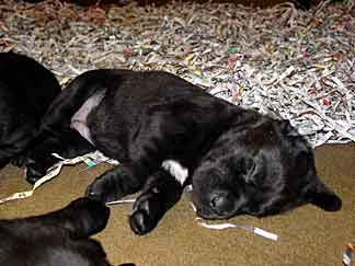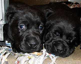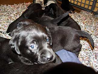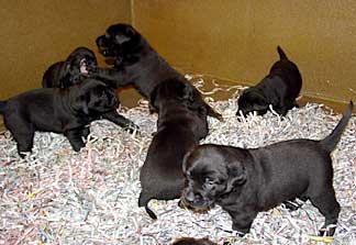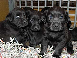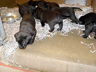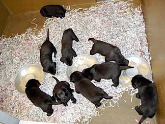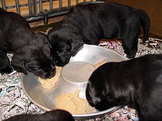 | "After 3 weeks of age, the wading pool is taken away and they are put on the floor on shredded newspaper. At this time they start eating solid food and are slowly weaned. They are fed a high-quality dry puppy feed mixed with meat and vitamins three times each day. " (from Guide Dogs for the Blind) | |||||||||||||