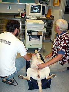 These two images are photographs of the ultrasound monitor on the cart. As it was explained to me, the round dark blobs are the puppies in their individual sacks and the white fuzzy splotch in the dark blob is the puppy. While there we could see one of the puppy's heart beating. It was moving fast, creating a really fuzzy spot in the center of the fuzzy splotch. Doc said a typical puppy heart beat is 180 beats per minute. Alda's heart beat is 88 beats per minute, I just checked.