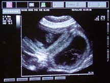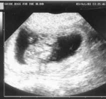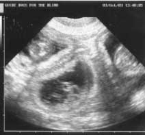 These two images are a scan of the paper printout they gave us. Left: Puppy is in center of dark blob. Right: 3 puppies are in each of their dark blobs. |