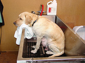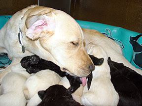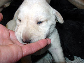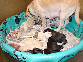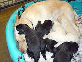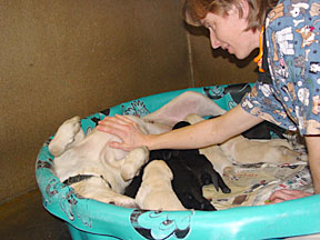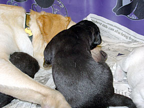 The pups are still healthy and gaining weight, averaging 1490 grams or 3.3 pounds. They are beginning to open their eyes, becoming more mobile, and learning coordination. Watch the movie of the pup rolling over if you want to see. Their nourishment is only from Alda's milk. They don't have any teeth yet. Alda is becoming more active and alert. She is eating her daily 10 cups of food without a problem, just like a lab. The high quantity of food is needed to produce enough milk for 8 pups. One day during her morning clean up bath, Bev came in the room and didn't recognize her. Bev wondered why a tired old dog was wagging her tail at the sight of her. I included a photo of a black lab laying across Alda's face to show the growth of the pups since birth. The "Birth" page shows it 2 weeks earlier. |