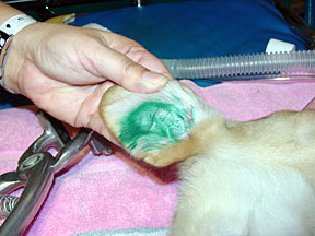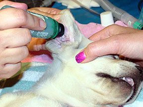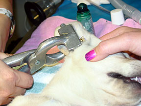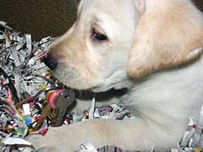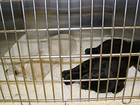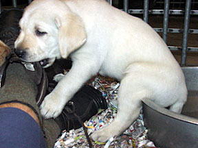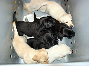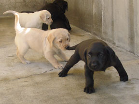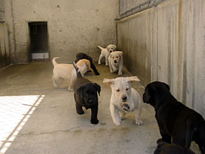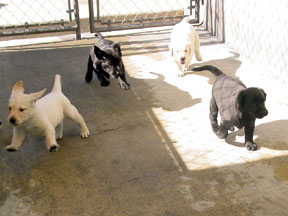 The pups are much more active, mouthy, and ready to explore new things around them. They were allowed to go outside and play, giving them the experience of a warm sun, and a place to run. One day, they pulled my keys from a pocket by the string and found the metallic noise, taste, and coolness a new experience. After 6 weeks old, they are given a complete physical, blood draw, and their unique tattoo in both ears. Following the exam they are taken to the Puppy Kennel. |