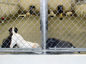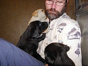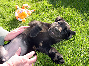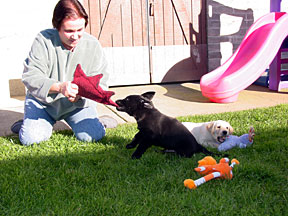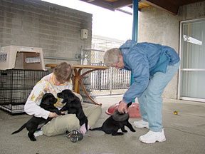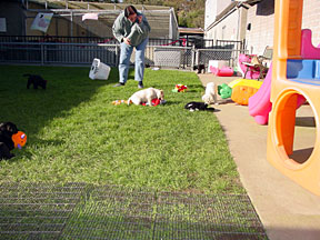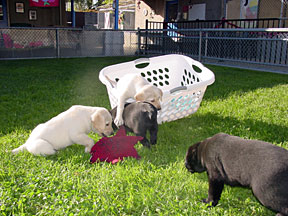 Following the physical checkup the pups were moved to the Puppy Kennel. At the Puppy Kennel they were placed into two stalls, 3 boys with a big girl and 4 girls. After a couple of days following the tattooing and physical, we are able to play with them in the socializing yard. The visits lasts about 30 minutes, because the pups begin falling asleep. The pups are socialized daily by a team of volunteers. At the end of this week they got to experience collars for the first time. There are two socializing yards, one is grass the other is cement. The grass was very interesting and they quickly began pulling it out. The cement area has a covered awning so it can be used when it is raining. Next week they will experience waking on a leash. Their walk will take them up the stairs to the graduation stage. |