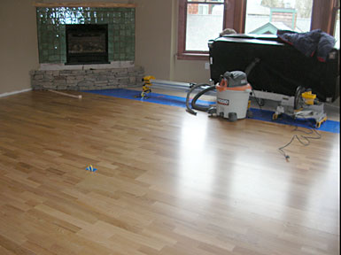 April 8, 2008 - Began the installation of the hardwood floor. We are happy with the quality and look of the floor. Had a little difficulty with mating the top step to the main field. I asked Gary if he could "be like Norm" and cut a new grove in the board to make it fit. "Norm" is Norm Abram of New Yankee Workshop on PBS. Gary was able to route a new tendon and glue it, that's why the steel bar is there.