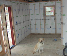 We insulated the walls (2x8 construction with staggered 2x4s) with blown-in insulation to create a value of R30. The ceiling insulation (also blown-in) is a R60 value. The ICF walls are a R50. During her spring-time shedding, the dog looses all her insulation, creating a clogged vacuum cleaner filter.