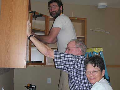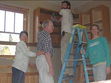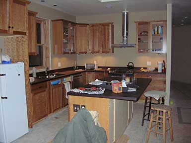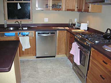 November 25, 2007 - With the help of Allan and Annemarie, we installed the cabinets, counter top, and appliances (except fridge). The exhaust hood over the stove will have a copper front or hood to hide the pipe. After cooking outside on the propane BBQ for a year, it was great to return to cooking indoors. We have started emptying the sea cargo container and found the kitchen pans, dishes, mixer, and cook books.