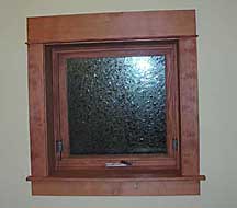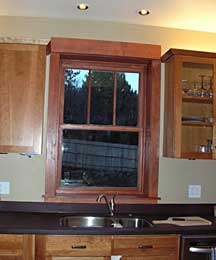 December 23, 2007 - We have begun installing the interior window trim. We are using a mahogany vegetable oil stain called "Osmo One Coat HS Plus." Here is a bathroom window and kitchen window.