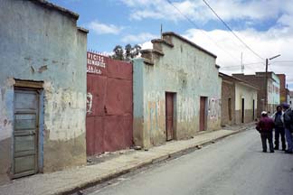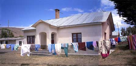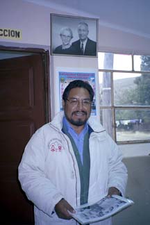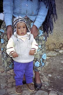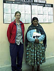 The staff was informally dressed in casual everyday clothes, only one or two of the staff was wearing a white smock. One nurse, an Aymaran woman in traditional dress with two long black braids, wearing many layers of skirts with her baby wrapped in a shawl over her back, showed us a family folder and the family's medical records. The chart shows family members' inoculation records, if they had any major injuries and if they have a latrine. There is a separate chart for children under 5 years old. Each week the nurse travels to the home and weighs and measures the newborn, checking on his or her progress. This 2 week-old baby boy is not taking the mother's breast. His weight is the same as at birth and they are worried that they will loose this child if they can't get him to nurse. I asked if other mothers share in the breast feeding of children in these cases, their culture will only permit mothers of boys to nurse other boys and mothers of girls to nurse other girls. The nurse also has a baby boy and did try to feed the infant, but still they were unsuccessful. The mother has plenty of milk, but the baby resists. They are trying to change the mother's diet to see if this will help the infant. Nurse who showed us a family folder and the family's medical records