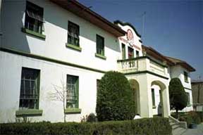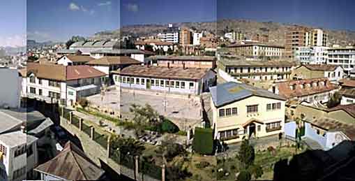 From the lower right corner, you enter the school grounds, walking up the staircase, past the school's logo painted on the wall. Turn left in front of the yellow 2-story building and enter the main offices. After meeting the director and getting a ticket from the receptionist, continue in front of the building and turn right at the corner to ascend the stairs up to the oldest building on the grounds. Behind this building, there are two more buildings, the farthest has a red-tile roof and white walls. Moving left you see the gymnasium with a curved gray roof with three spines. Continuing down hill, you walk past five more buildings, ending at the two-story white building with a red-tile roof, near the basketball court. The grounds cover 4 city-blocks and have a 2-lane-road tunnel under the soccer field on the upper grounds.Panoramic pictures were taken from our hotel room.